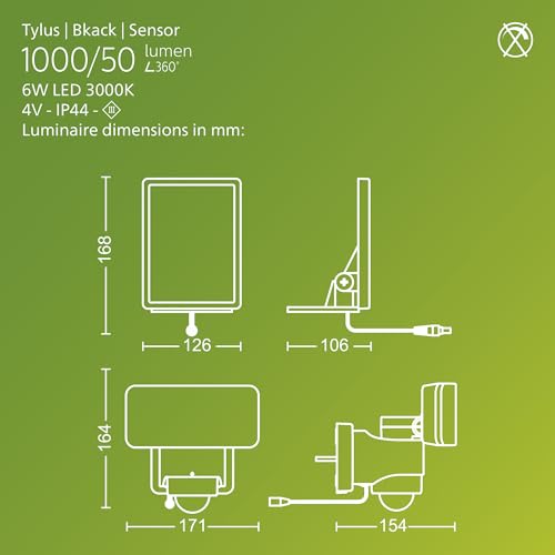 PHILIPS Tylus UltraEfficient Outdoor Solar Security Light with Sensor, 3000K, 1000/50lm, Black