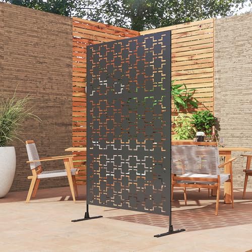 Outsunny Decorative Garden Privacy Screen with Stand, 6.5FT Freestanding Metal Outdoor Divider, Decorative Privacy Panel with Expansion Screws for Garden Pool Hot Tub, Grid Style, Black