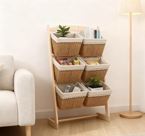 SUNNYNEST 3-Tier Wooden Floor Display Rack,Fruit & Vegetable Basket Stand Rack, Floorstanding Snack Display Racks for Living Room Laundry Retail Concession