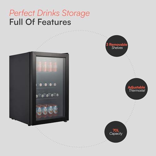 Cookology CBC70BK Under-Counter Drinks Fridge in Black - 70L Capacity - Beer, Wine/Drinks Fridge - Adjustable Temperature Control - Suitable for Cans & Bottles - Energy Efficient - Double Glazed Glass