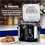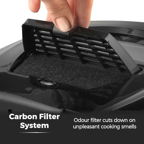 Adjustable thermostat, Multi-function handle with lifting system, Removable lid with odour filter, Basket can be raised and lowered when the lid is down, Large observation window, Safety interlock and auto-open with release button, Non stick pan for easy cleaning, Indicator light