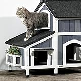 PawHut Wooden Outdoor Cat House w/ Flower Pot, Windows, Multiple Entrances