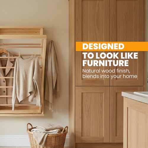 Novecrafto Wall Mounted Wooden Clothes Drying Rack with Double side Rails - Foldable & Space-Saving Clothes Airer in Natural Natural