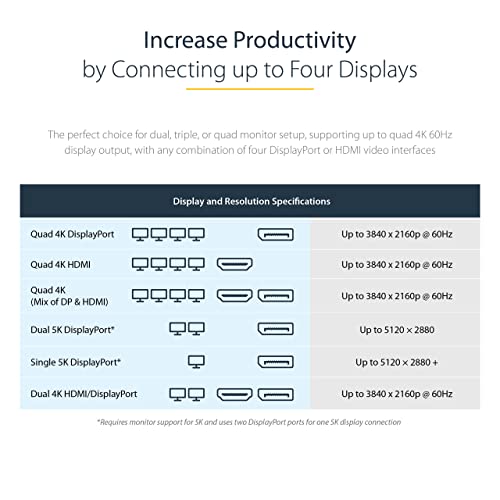 StarTech.com USB C Dock - 4K 60Hz Quad Monitor DisplayPort & HDMI - Universal USB-C Docking Station with 100W Power Delivery - USB Hub with 1x USB Type-C & 3x USB-A Ethernet Audio
