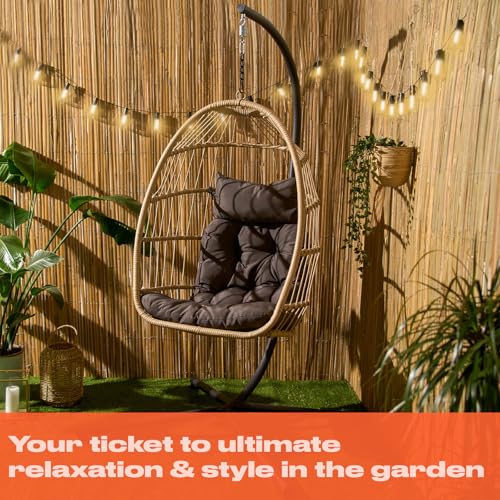 OHS Hanging Egg Chair, Rattan Swing Chair Wicker Hammock with Stand Garden Swing Indoor Outdoor Patio Furniture Relaxing Comfy Foldable Egg Chair with Cushion Included, Natural Beige