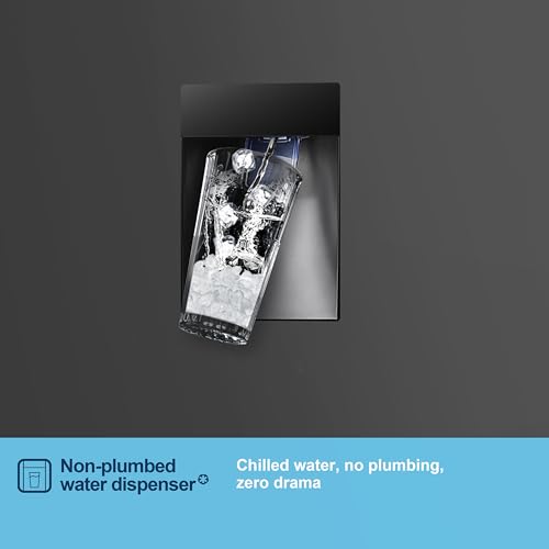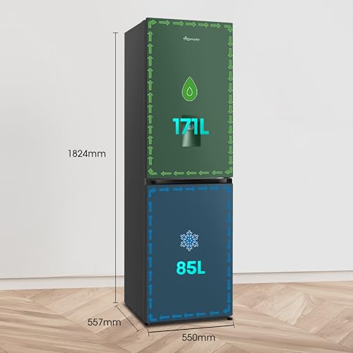 Fridgemaster MC55251DEB 55cm Freestanding 256 litre 50/50 Fridge Freezer with Non-plumbed Water Dispenser - Frost Free - LED Lighting- 4 Star Freezer Rating -Black - E Rated, H182.4 x W55 x D55.7 (cm)