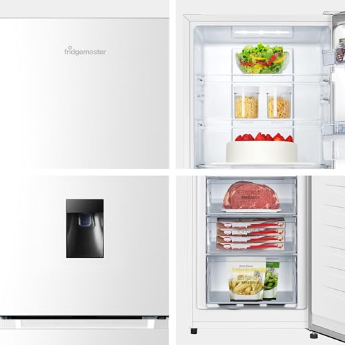 Fridgemaster MC55251DE 55cm Freestanding 256 litre 50/50 Fridge Freezer with Non-plumbed Water Dispenser - Frost Free - LED Lighting- 4 Star Freezer Rating -White - E Rated, H182.4 x W55 x D55.7 (cm)