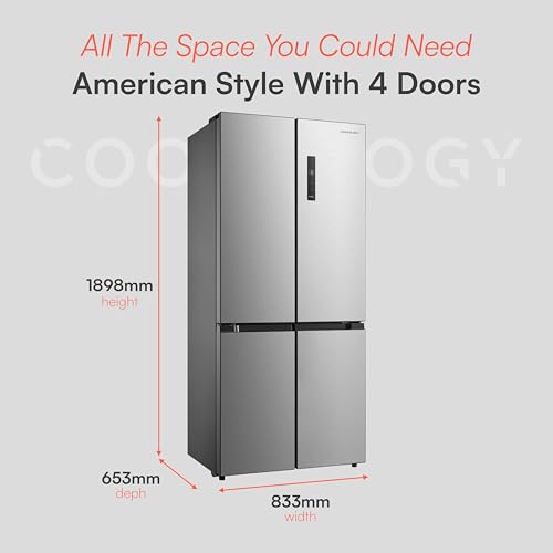 Cookology QUAT515IX Freestanding 515 Litre Four Door Fridge Freezer, American Style, Frost Free, 4 Star Freezer Rating, Low Noise, Smart LED Light, Touch Screen Temperature Control - Inox