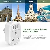 UK to European Adapter Plug 2 Pack, EU Schuko Travel Adaptor with 3 USB Port, Euro Europe Grounded Charger for Germany France Spain Turkey Iceland Greece Poland Portugal Austria Netherlands(Type E/F)