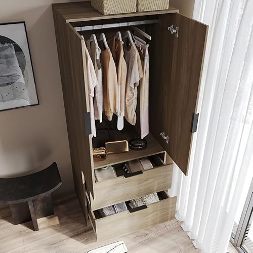 URBNLIVING 2 Door 2 Drawer Minimalist Bedroom Oak Wardrobe Storage & Hanging Rail Modern Furniture with Clothes Shelf for Home Organiser Unit 179cm H x 74cm W x 50cm D