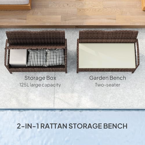 Outsunny Rattan Garden Bench w/ 125L Storage, Cushioned Outdoor Bench, Brown