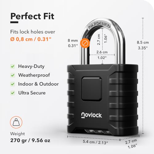 NOVLOCK Heavy Duty Combination Padlock Outdoor – Weatherproof, Cut-Resistant, 0.31" (8mm) Shackle – for Gates, Fences, Sheds, Storage Units, Lockers, Cabinets – 1-Pack, Black