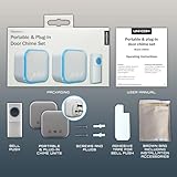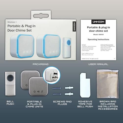 Uni-Com Wireless Portable & Plug-in Door Chime Set, 150m Operating Range, 30 Different Chimes, LED Chime Alert, 3 Operating Modes, Easy Install, White