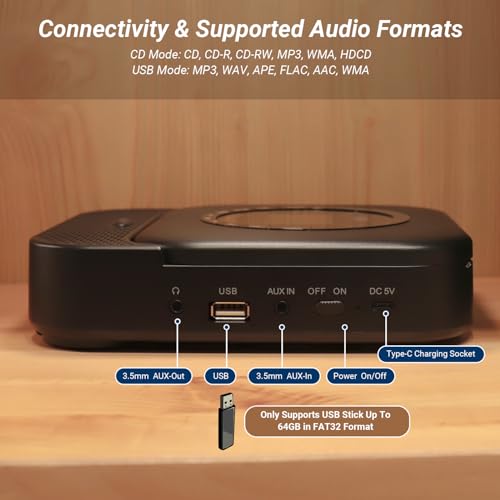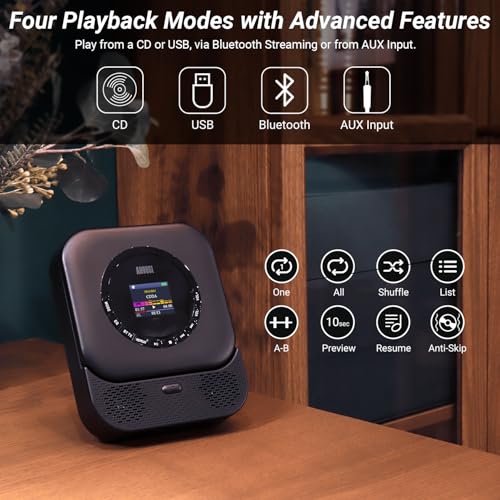 August SE15B Portable CD Player for Home, Car & Travel - Bluetooth 5.3, USB Port, 3.5mm AUX In/Out, 6W Stereo Speakers – Wall-Mountable Rechargeable Discman with Earphones & Remote, EQ, Anti-Skip