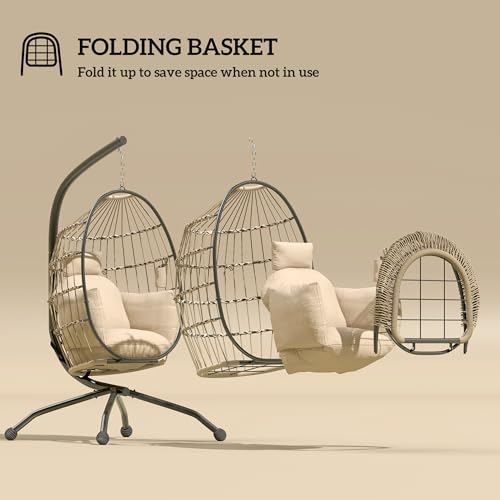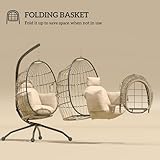 Outsunny Hanging Egg Chair Outdoor Indoor Garden Swing Chair with Folding Basket and Thickened Cushion, Garden Hanging Chair with Stand, Headrest, Cup Holder for Patio, Balcony, Khaki