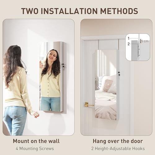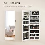 HOMCOM Jewellery Cabinet with LED Lights, Door Hanging or Wall Mounted Full Length Mirror with Storage, Lockable Jewellery Organiser, White Surface and Black Lining