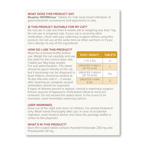 BEAPHAR WORMCLEAR TABLETS FOR CATS KILLS ROUNDWORMS & TAPEWORMS 4 TABLETS