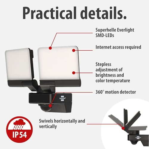 Brennenstuhl Connect WiFi LED Duo Floodlight with Motion Sensor WFD 3051 P/LED Security Light 36W for uutdoor use IP54 controllable via Free app (4300lm, up to 12m Range, wth Detection Angle 120°)