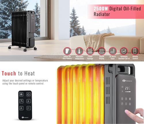 PureMate 2500W 11 Fin Oil Filled Radiator - Portable Electric Heater w/ Digital Screen, Touch Control, Adjustable Thermostat, 3 Heat Modes, 24Hr Black