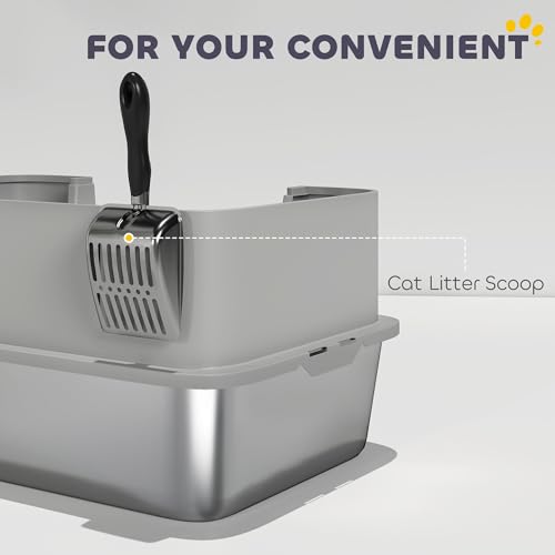 PawHut Stainless Steel Litter Box with Scoop, High Sided Cat Litter Tray, Grey