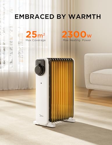 Midea Oil Filled Radiator, 2300W, 11-Fin Portable Electric Heater with Knob Controls, Adjustable Thermostat, 3 Heat Settings, Tip-Over & Overheat Protection, UltraQuiet Operation for Office & Home Use