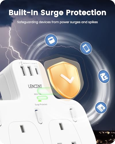 LENCENT 3 Way Plug Extension with 1 USB C and 2 Ports, Surge White