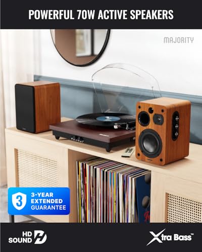 MAJORITY Bluetooth Active Bookshelf Speakers | Powered Stereo Speakers, USB Playback and Charging | HDMI ARC, Optical, Phono, Aux | Turntable Speakers | Extra Bass D70X Active Walnut
