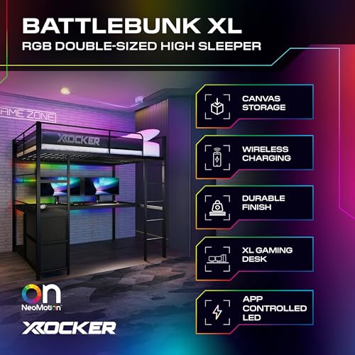 X-Rocker Battlebunk 4ft6 Double, RGB LED Bunk Bed - Neo Motion™ Sync App-Controlled Lights, XL Desk & PC Storage Shelf, High Sleeper, Sturdy Metal Frame for Kids & Teens - Black - 135x190cm