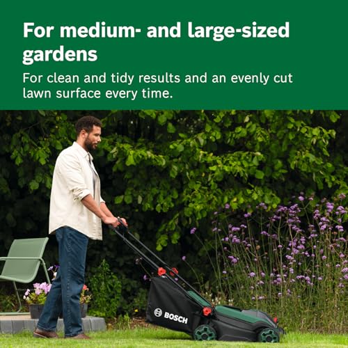 Bosch Cordless Lawn Mower ROTAK18V2-38 (Cutting Width: 38 cm, Height of Cut: 30-75 mm, 40 l Fabric Grass Bag, Mulch Plug, incl 2 x 18V Battery and Charger)