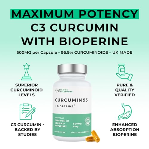 Curcumin 95 + Bioperine® by LLS | High Strength Turmeric Curcumin Capsules containing 96.9% Curcuminoids and Black Pepper Extract | 500mg x 60 Veg Capsules | Made in UK Under GMP/BRC License