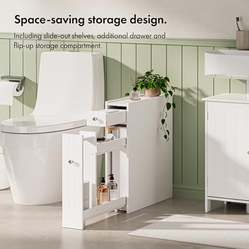 VonHaus Slim Bathroom Storage Unit - White Slimline Bathroom Cabinet - Narrow & Compact Bath Organiser with Drawer & Slide Out Shelving - Freestanding Shaker Style Storage - Holbrook