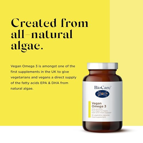 BioCare Vegan Omega-3 | Vegetable Capsules | DHA and EPA from Algae for Heart, Brain and Vision Support | Food Supplement | Suitable for Vegetarians and Vegans | 60 Capsules