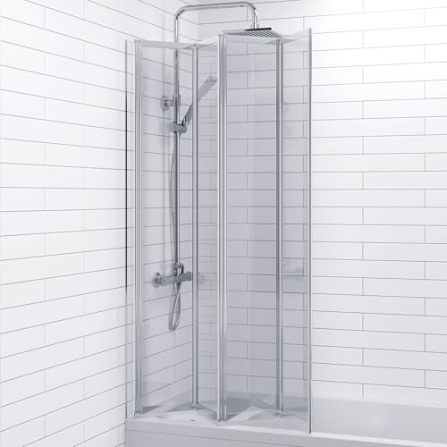 Luxura® 4 Panel 1000 x 1400mm Chrome Framed Over Bath Shower Screen for Bathroom 4mm Clear Toughened Safety Glass Panel 180° Pivot Folding Hinged Splash Guard Panels & Screens for Baths Reversible