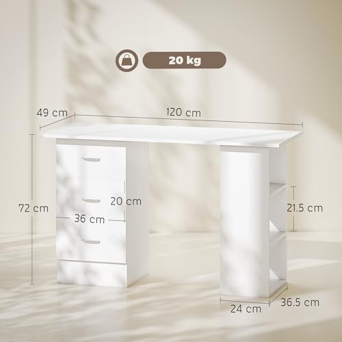 HOMCOM Computer Desk, Home Office Desk, Writing Table, PC Workstation with 3 Storage Shelves and 3 Drawers for Working, Study, 120 x 49 x 72 cm, White