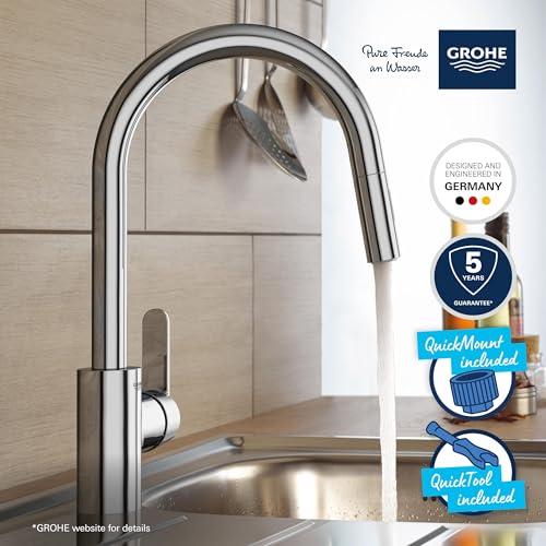 GROHE Get - Kitchen Sink Pull-Out Mixer Tap (2 Spray Options, High Spout, 360° Swivel Range, 35mm Ceramic Cartridge, Smooth Docking, Tails 3/8 Inch, QuickMount Included), Size 381mm, Chrome, 31484001