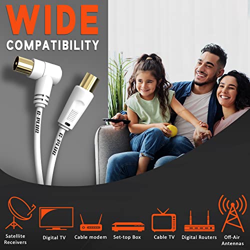 2m TV Aerial Cable with Right Angled Plug + Adapter – Coaxial RF Lead Male to Male – Gold-Plated Connector – Freeview, Freesat, Sky Box, BT, TV Antenna Extension