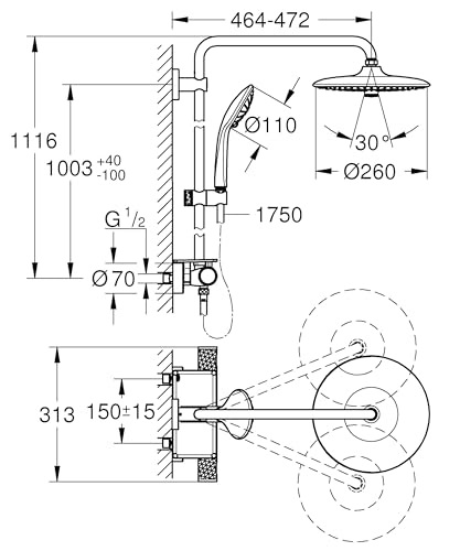 GROHE Vitalio Joy 260 - Cool Touch Thermostatic Mixer (26 cm Shower Head with 3 Spray, Toiletries Tray, 11 cm Hand Shower 3 Spray with Easy Clean Nozzles, 1750 mm Twist-Free Hose), Chrome, 26403002