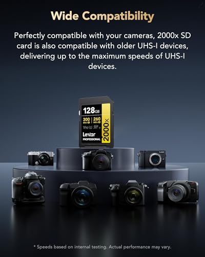 Lexar Professional 2000x SD Card 128GB, SDXC UHS-II Memory Card, Up to 300MB/s Read, 260MB/s Write, Class 10, U3, V90 SDXC Card for DSLR, Full-HD Cinema-Quality 8K Video Cameras (LSD2000128G-BNNAG)