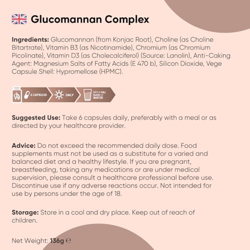 Glucomannan Capsules from Konjac Root - 180 Glucomannan Powder Capsules - With Choline, Chromium, Vitamin D3 & Vitamin B3 - Non-GMO, Gluten-Free & Vegetarian-Friendly - 1 Month Supply - Made in the UK