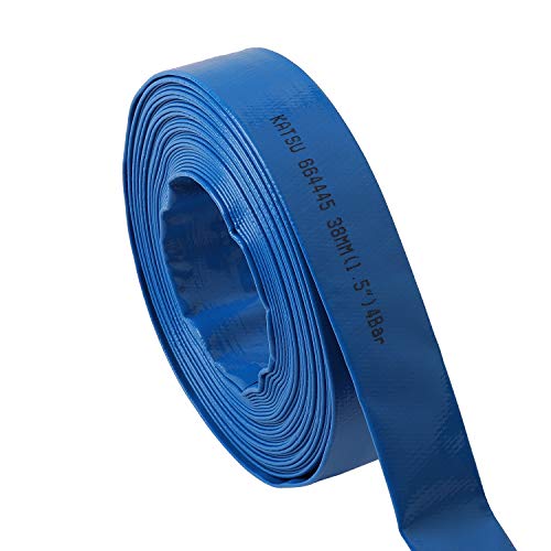 KATSU Layflat Discharge Hose Pipe 20m x 38mm 1-1/2 Inch Diameter with 2 Clips and Quick Coupler Connector, Fits Submersible & Other Water Pumps for Draining Pond, Garden Irrigation, Hot Tub, Pool