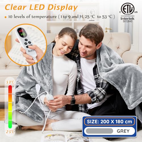 Mia&Coco Electric Heated Blanket Throw Flannel Sherpa Fast Heating 200x180cm, 10 Heat Levels & Up-to-9-Hours Auto-Off Timer & LED Display, for Home Office Use, Machine Washable, ETL Certified,Grey