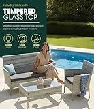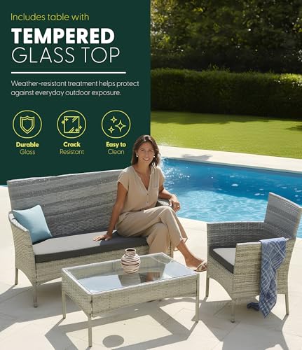KEPLIN 4 Piece Rattan Garden Furniture Set – Outdoor Sofa, 2 Chairs & Tempered Glass Coffee Table, Durable Weather-Resistant Wicker Patio Lounge Set with Cushions for Garden, Balcony & Patio (Grey)