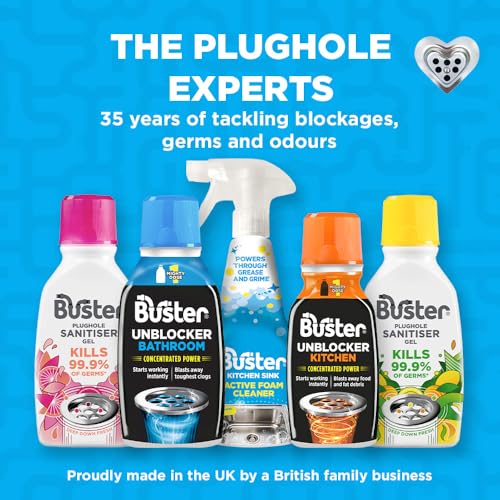 Buster Bathroom Drain Unblocker (Pack of 2 x 300ml) Fast-Acting Sink Unblocker Dissolves Hair, Sludge and Soap, Drain Cleaner Clears Blockages in Shower, Bath and Bathroom Sink Pipes - Made in UK