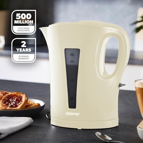 GEEPAS Electric Kettle | 1.7L Cordless Fast Boil Jug Kettle for Hot Water Tea or Coffee | Boil Dry Protection & Auto Shut Off | Illuminated Switch, Cord Storage | 1 Year Warranty, 2200W Biege