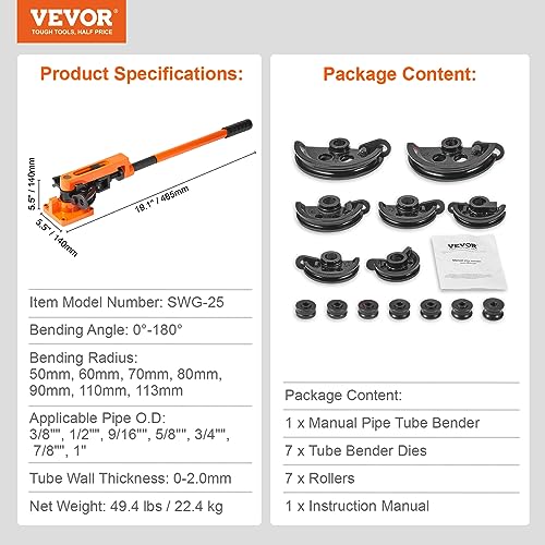 VEVOR Pipe Tube Bender, 3/8" to 1" OD Manual Pipe Tube Bender with 7 Bending Dies, 180° Copper Aluminum Pipes Bending Tools for HVAC Air Conditioning Refrigerator Auto Repair