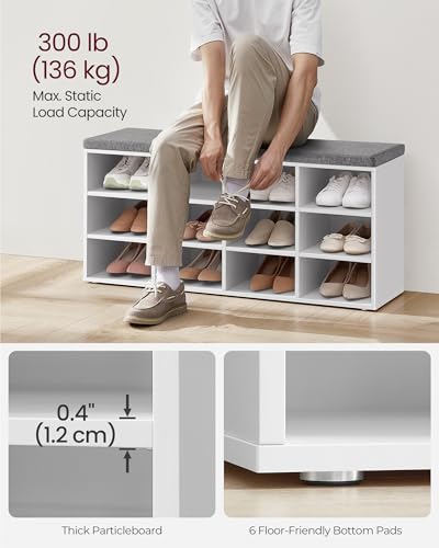 VASAGLE Shoe Bench, Storage Bench with Padded Seat, with Cushion, 12 Compartments, Adjustable Shelves, for Living Room, Hallway, 30.3 x 104 x 48 cm, Cloud White LHS012W14
