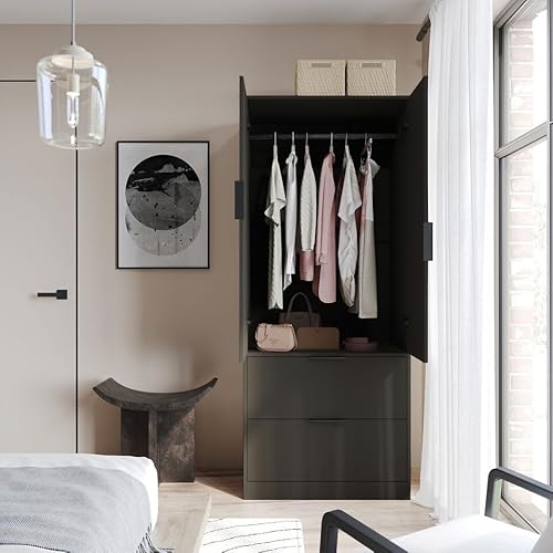 URBNLIVING 2 Door 2 Drawer Minimalist Bedroom Black Wardrobe Storage & Hanging Rail Modern Furniture with Clothes Shelf for Home Organiser Unit 179cm H x 74cm W x 50cm D