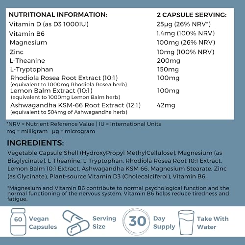 Cortisol Reducing Supplement for Stress, Calm & Sleep Support – Ashwagandha KSM-66, Magnesium Glycinate, L Theanine, Lemon Balm, L Tryptophan, Rhodiola, Zinc, D3 & B6 – 60 Capsules - Calma Pact
