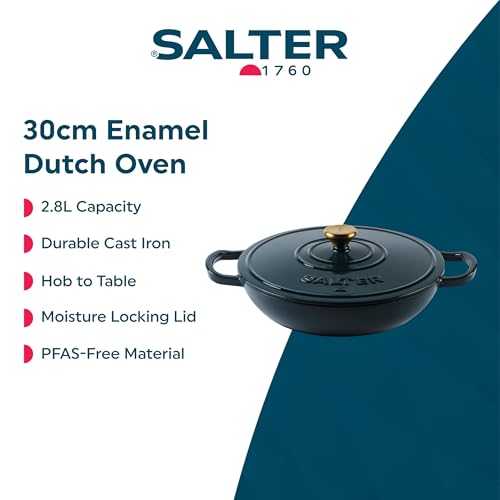 Salter Chester Shallow Cast Iron Casserole Pot – 30cm Dutch Oven/Stock Pot, Self Basting Lid, Enamel Coated Cast Iron, Oven Safe, Suitable for All Hobs Including Induction, 2.8L Cap., PFAS-Free, Green