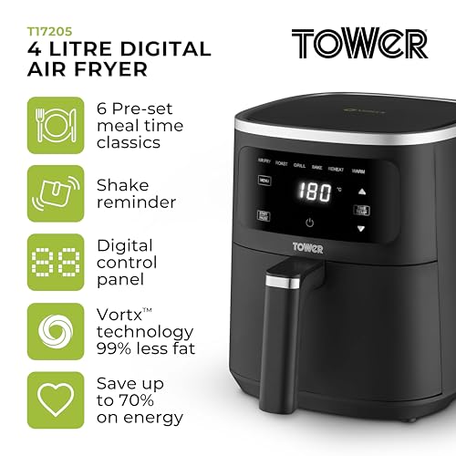 Tower 4L Single Basket Digital Air Fryer with Vortx Technology, 6 Cooking Pre-Sets,Digital Control Panel, 1300W